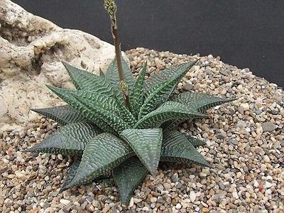Haworthia limifolia is grooves and ridges on the leaves, but the ridges in this plant are highlighted with a whitish color, making it one of the most ornamental of all the Haworthias. It grows the new offset easily. The white flowers with greenish veins are the bloom on an up to 14 inches (35 cm) tall inflorescence.